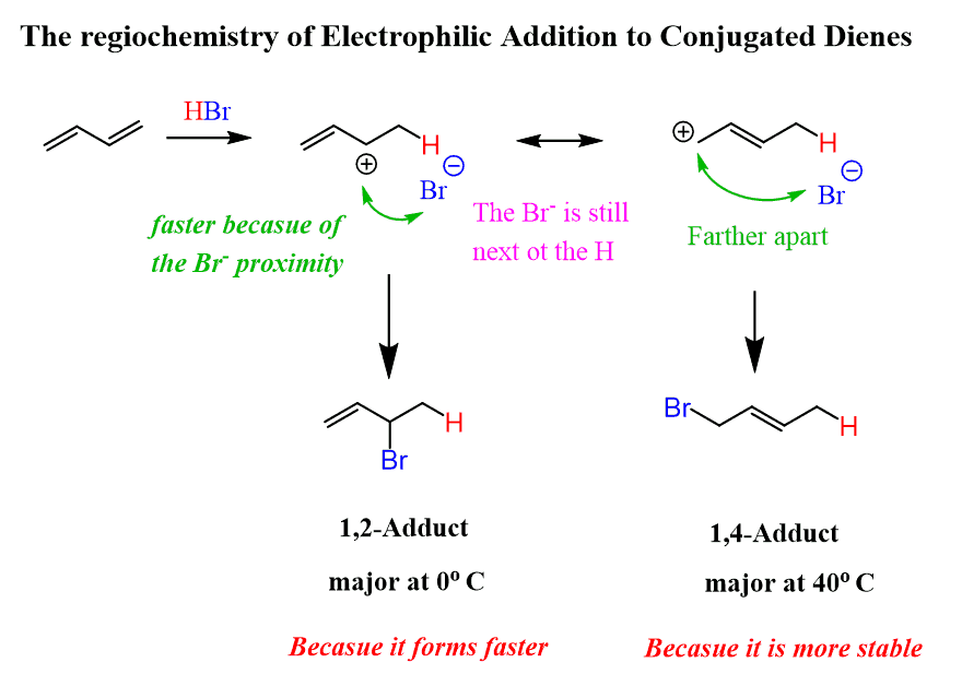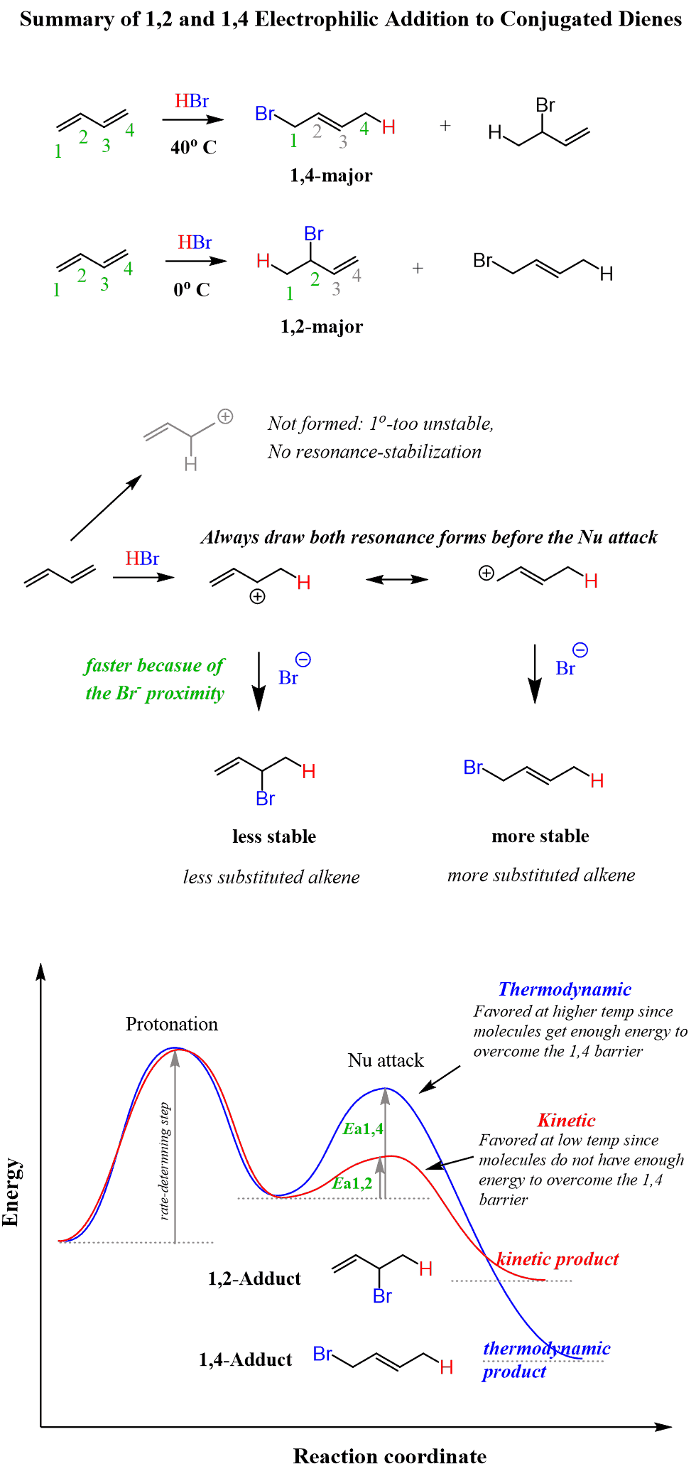 - 1,2-adduct (kinetic product): Forms faster, favored at low temperatures