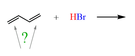 The mechanism of electrophilic addition to dienes is similar to what we learn in the addition reactions of alkenes. The difference here is that there are two double bonds, and the question you may start wondering about is: