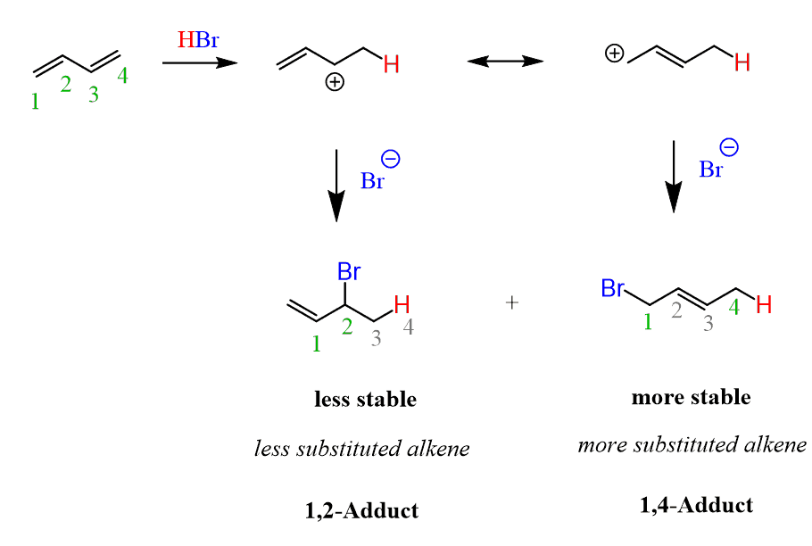 Let’s number the carbons to distinguish these products more easily. The more stable product is called a 1,4-adduct, and the less stable product is the 1,2-adduct. They are formed by a 1,4- and 1,2-addition, respectively.