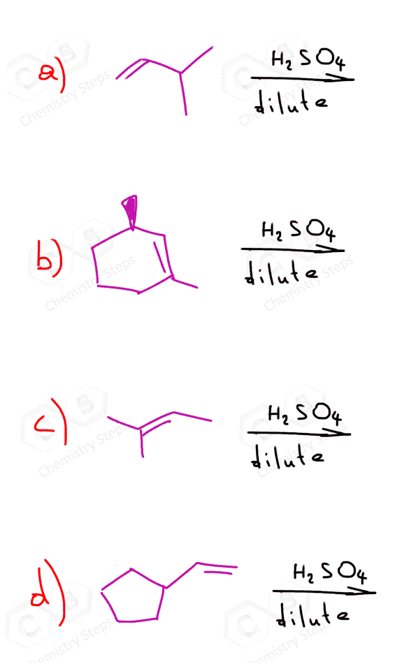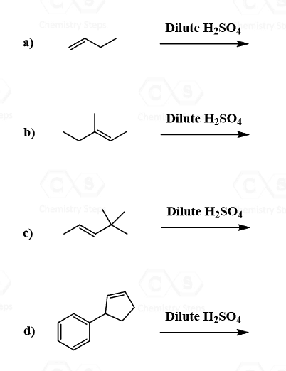Predict the product for reactions (a) – (b) if an acid-catalyzed hydration had been performed rather than