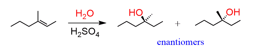 As we see in the mechanism shown above, if acid-catalyzed hydration produces an alcohol with one chirality center, then the products will be a mixture of two enantiomers: