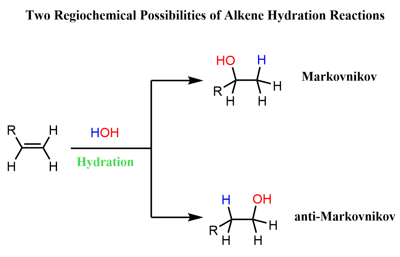 The addition reactions of water to alkenes (hydration of alkenes) can be viewed as adding an H and OH groups to the double bond. There are a few ways of achieving this, and the key difference is the regiochemical outcome of the reaction. More specifically, depending what reagent we use, the addition to water can be in Markovnikov or anti-Markovnikov fashion: