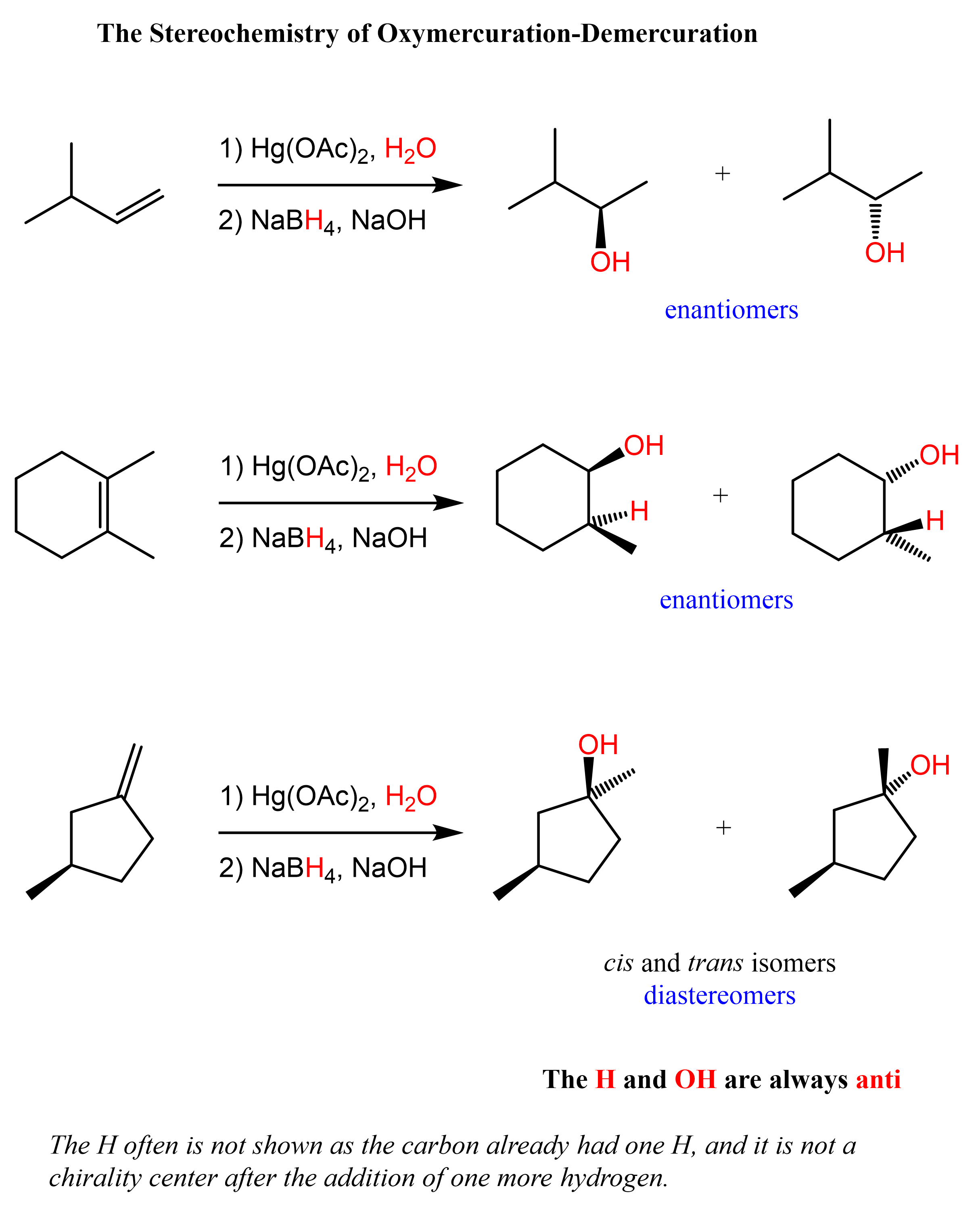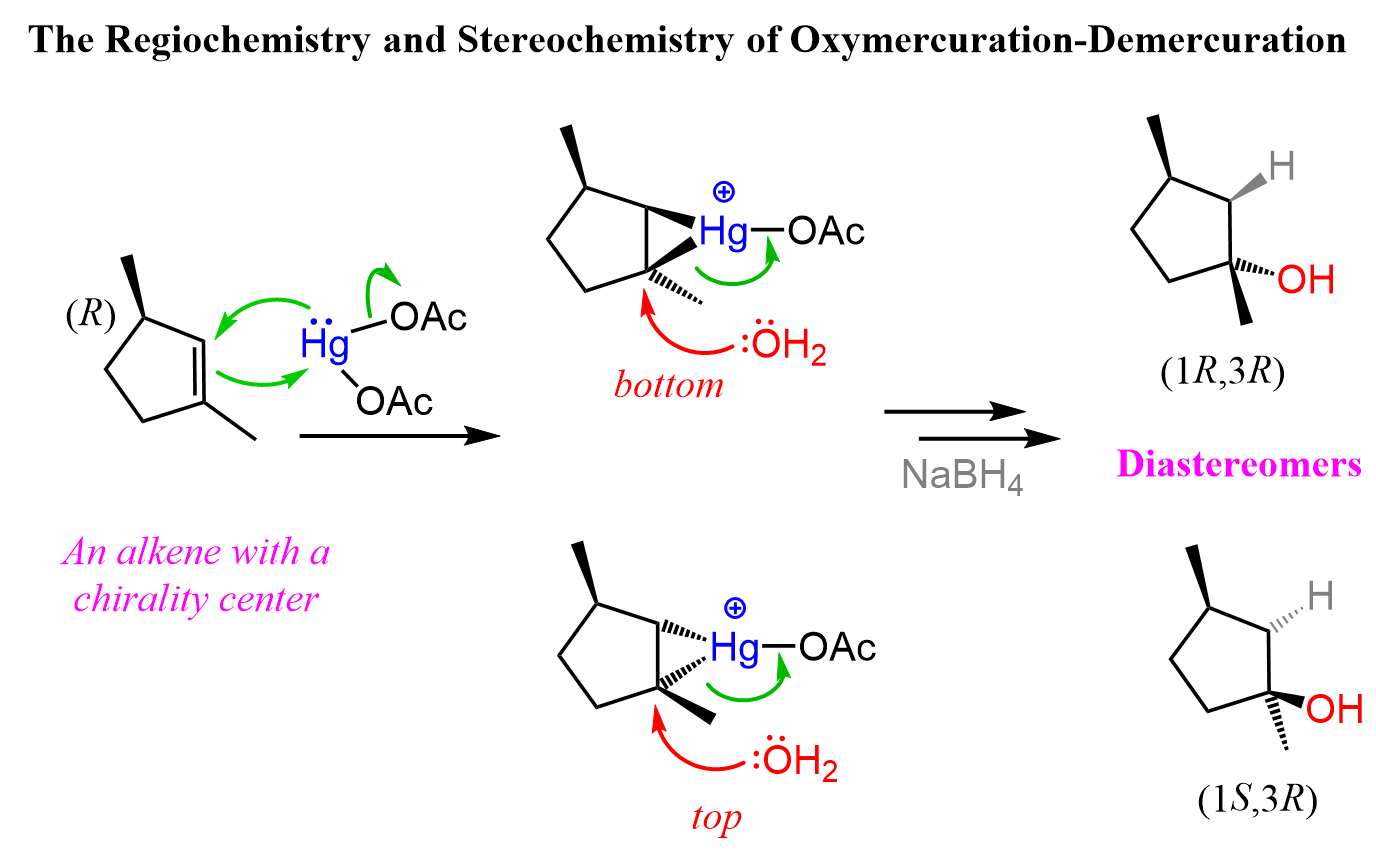 This is because while the newly-forming centers are going to be R and S, the original chirality center is intact, thus the alcohols are not mirror images. Let’s also show the mechanism of how diastereomers can form in oxymercuration-demarcation relations: