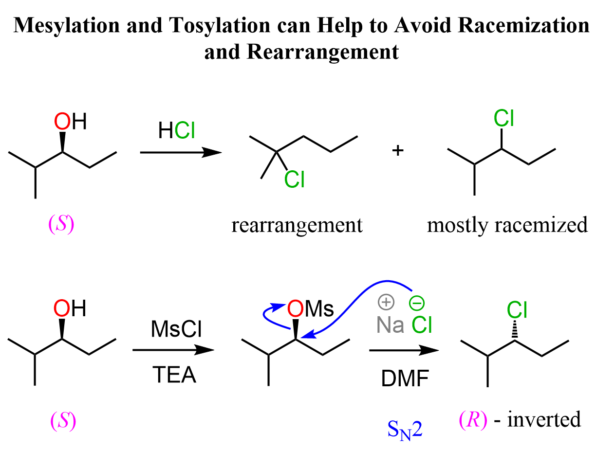 The stereochemistry of the product is very important, so a natural question here would be how to control it when converting chiral alcohols to alkyl halides. There are a couple of workarounds you need to know. One of them is the use of mesylates and tosylates which are essentially forms of the alcohol where the OH is converted into good leaving groups. Instead of the HX acids, mesylates, and tosylates are reacted with the corresponding halide ions in polar aprotic solvent to enforce the SN2 mechanism: