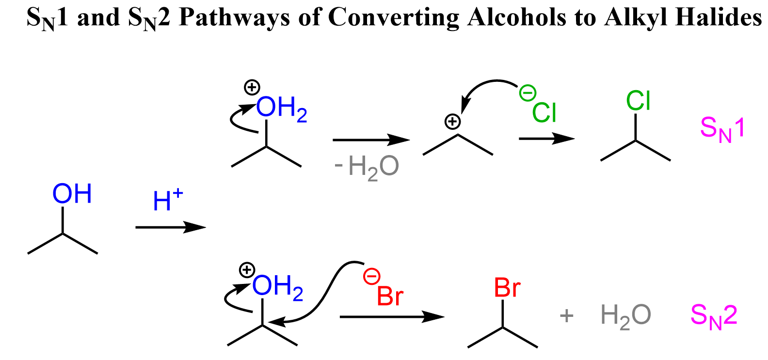 There are several ways of converting alcohols to alkyl halides. The most common, and perhaps the one that covers nuances of SN1 and SN2 reactions is the use of HX acids (HCl, HBr, HI), so let’s start with that.