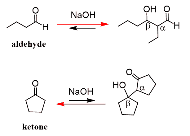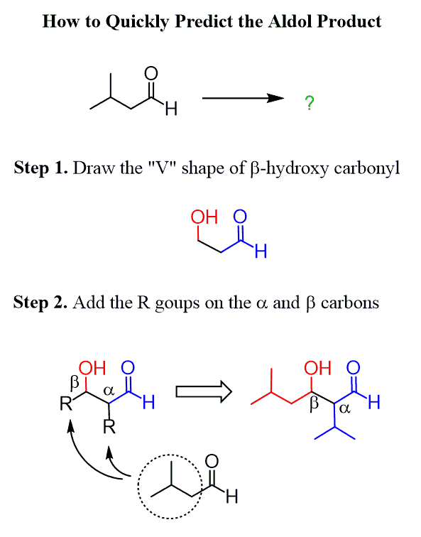 Remember, we talked about the strategy for quickly determining the product of aldol addition reactions. In short, you needed to draw the “V” shape of the β-hydroxy carbonyl unit and add the remaining alkyl groups based on the aldehyde or the ketone being reacted: