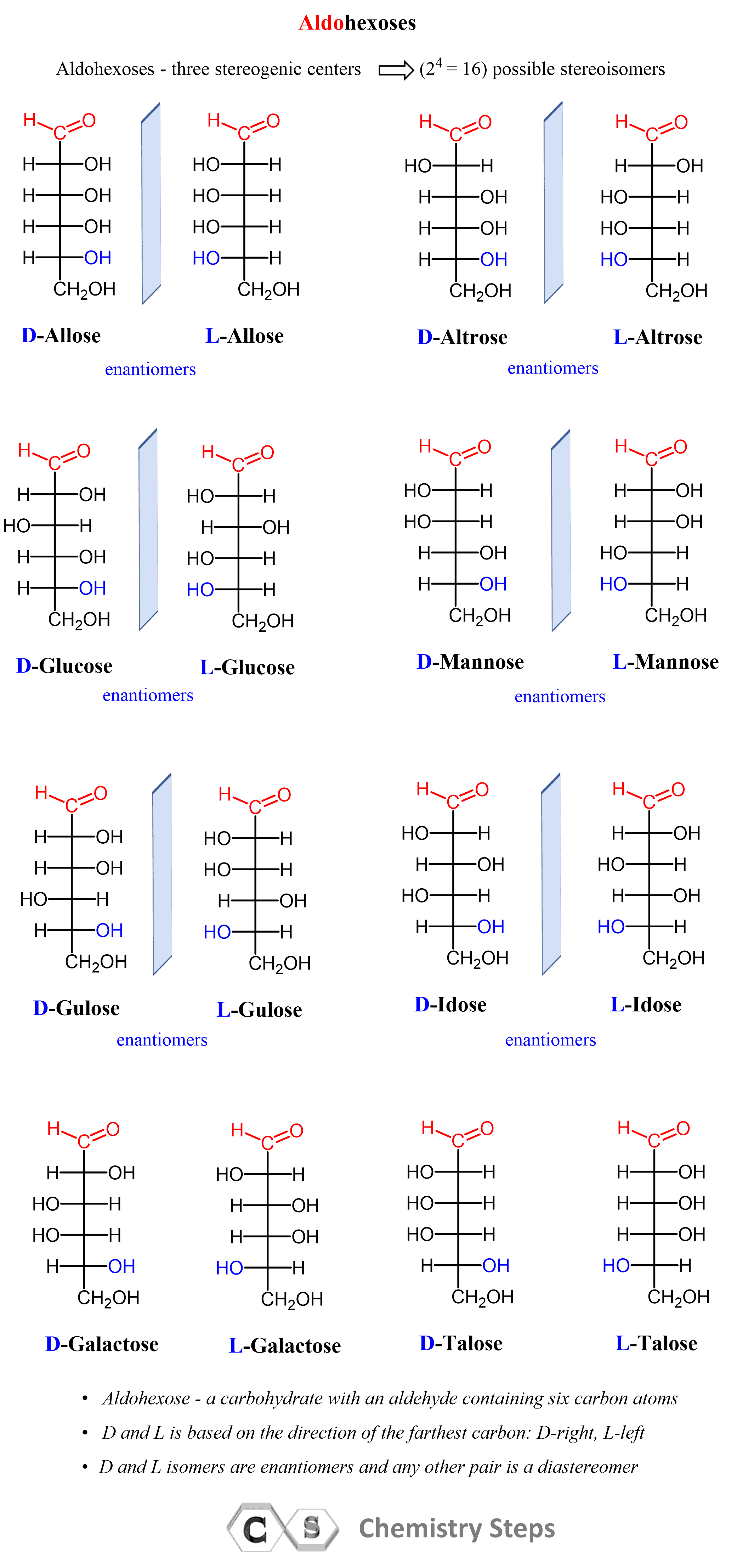 Aldohexoses have four stereogenic centers which means there are eight (24 = 16) possible stereoisomers This corresponds to eight pairs of enantiomers – eight D aldohexoses, and eight L aldohexoses: