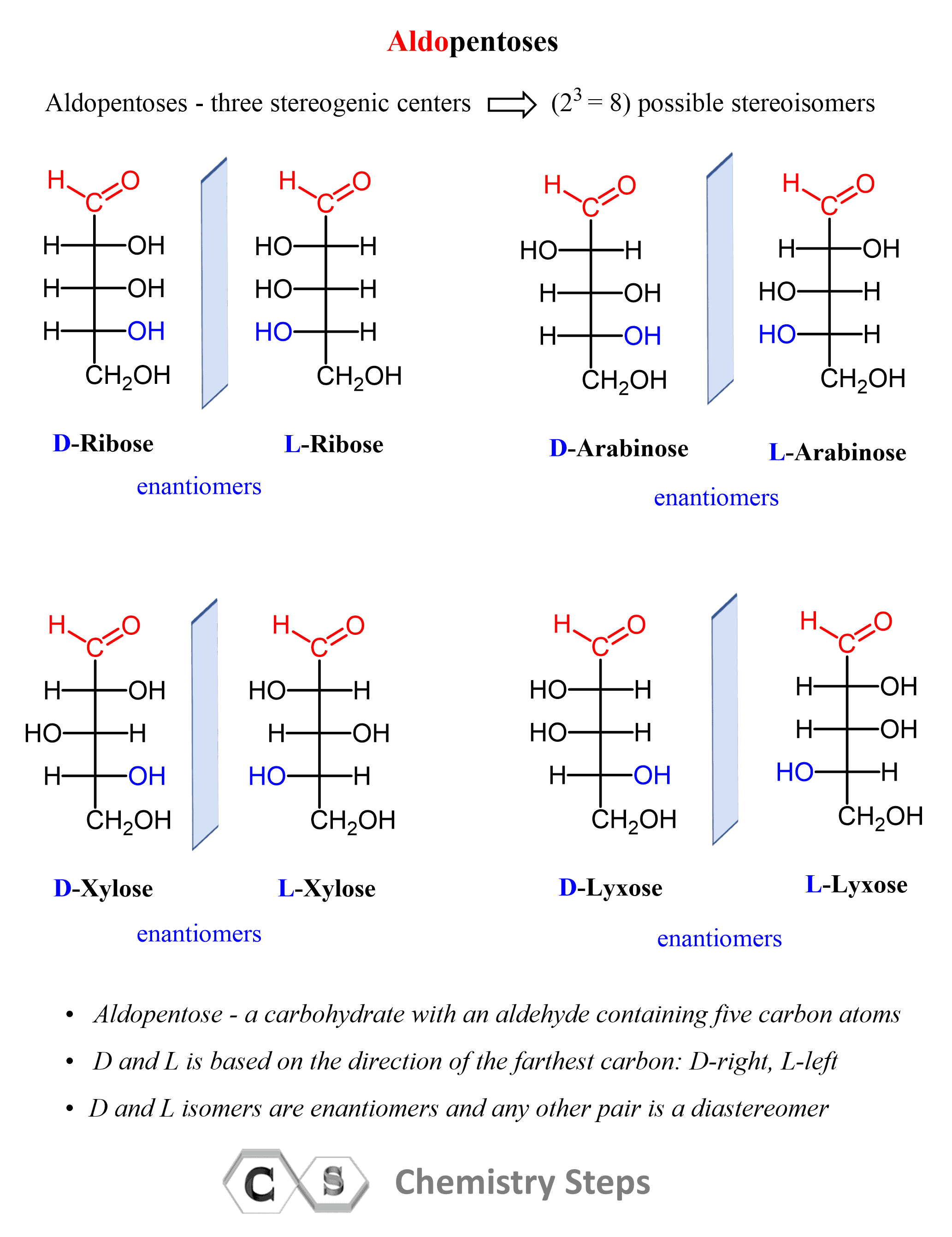 Aldopentoses have three stereogenic centers, and therefore there are eight (23) possible stereoisomers (four pairs of enantiomers). Four of the possible aldopentoses are D sugars, while the other four have an L configuration: