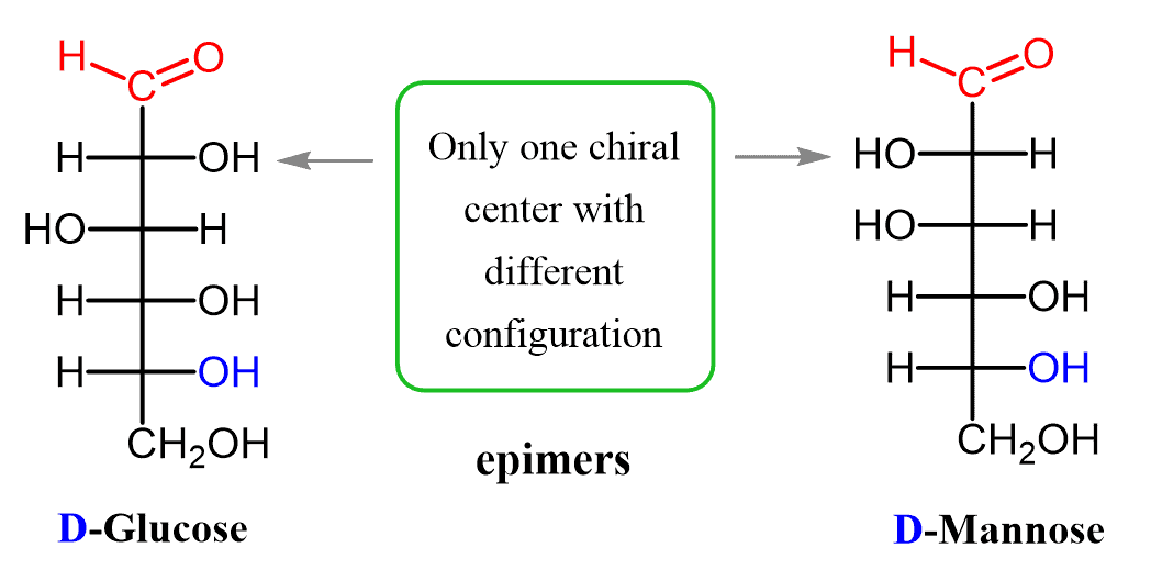 For example, D-Glucose and D-mannose are diastereomers since the configuration of only one stereogenic center is changed.