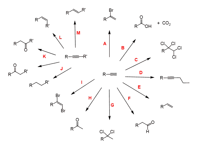 These include the preparation of dialkyl halides and their use in the preparation of Alkynes by Elimination Reactions, Hydrohalogenation, Hydration, Hydroboration–Oxidation, Ozonolysis, and other reactions of Alkynes and Alkenes, including the Zaitsev and Hoffman elimination reactions.
