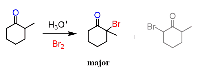 Aldehydes have only one ɑ carbon and therefore, there is no regiochemistry to be considered. Ketones, on the other hand, have two ɑ carbons and if it is an unsymmetrical ketone, the halogenation occurs primarily at the more substituted ɑ carbon: