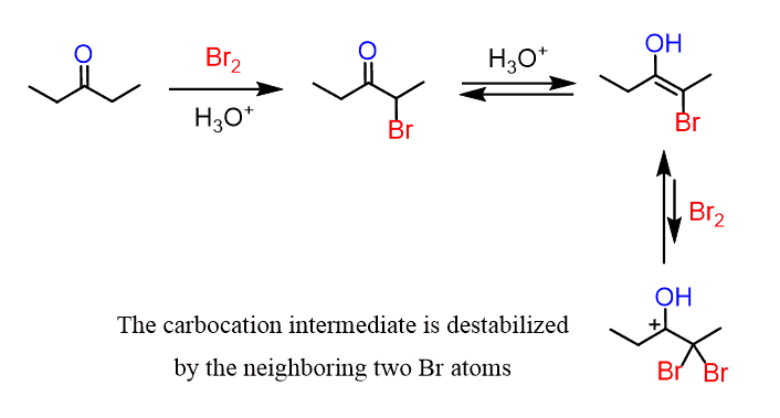 The reason for this higher reactivity is the increase of acidity of the alpha proton connected to the carbon with an electronegative halogen atom. As a result, all the protons are substituted by a halogen leading to dihalogenation and a trihalo carbonyl compounds for methyl ketones.