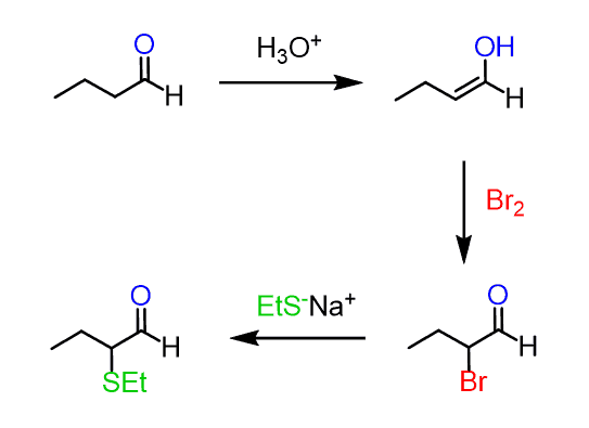 For example, butanal can be converted to 2-bromobutanal and further reacted with a good nucleophile such as a sulfide: