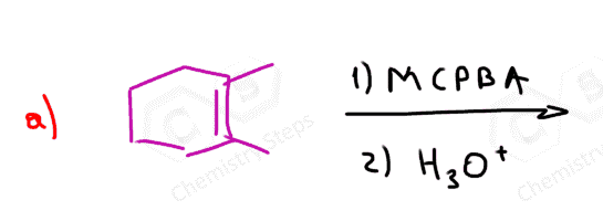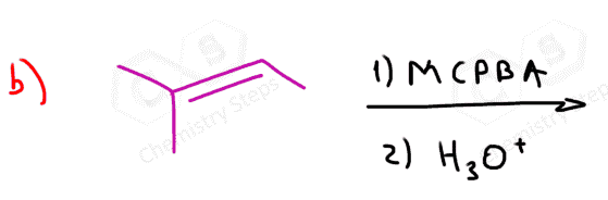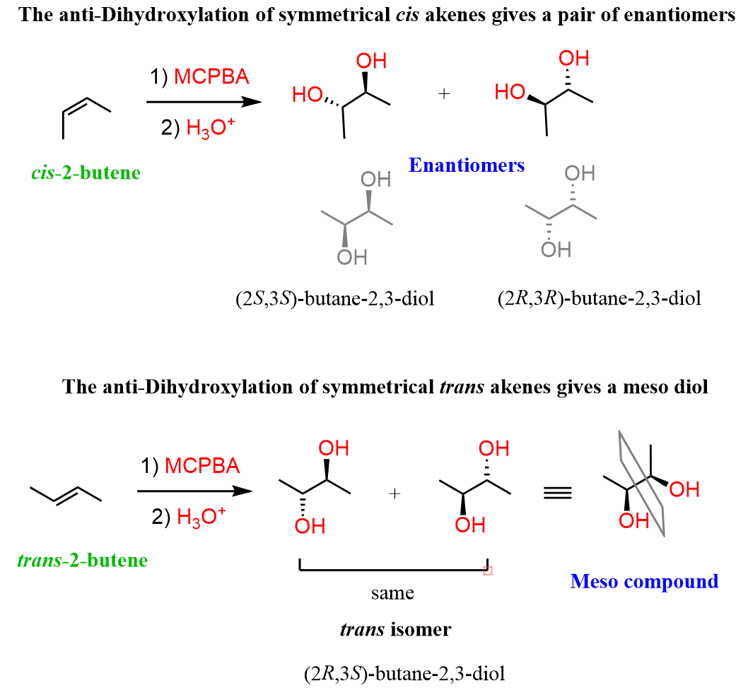 In this post, we will focus on the anti-dihydroxylation which is achieved by converting the alkene into an epoxide first. This is usually done with peroxyacids such as MCPBA (meta-chloroperoxy benzoic acid) or Peroxyacetic acid: