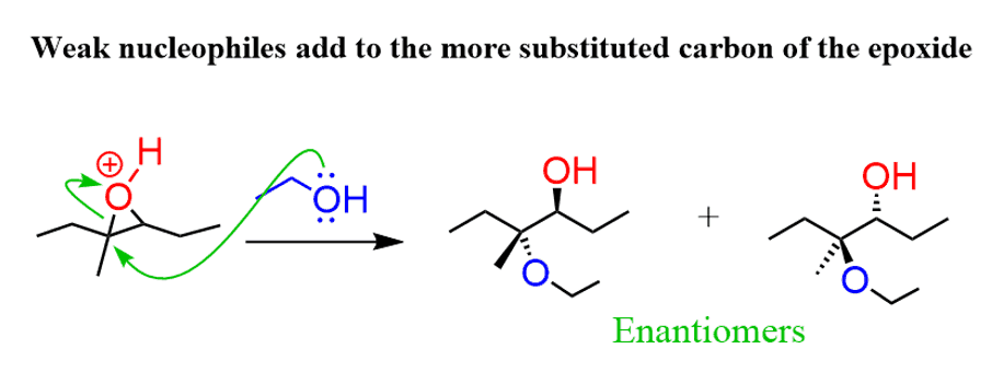 Under acidic conditions, when a weak nucleophile is used, it attacks the epoxide at the more-substituted carbon. For example, when alcohol is used as the nucleophile, it attacks the first carbon, therefore the reaction is regioselective: