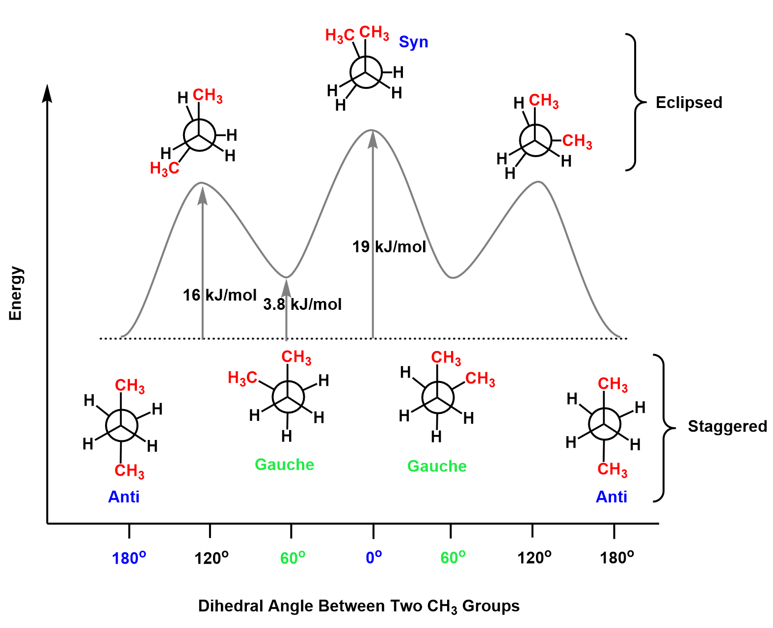 So, what is special about the antiperiplanar arrangement that you need to know for your organic chemistry class? Well, first of all, let’s mention that the term antiperiplanar does not exclusively refer to the methyl groups in butane. We can use it for any atoms or groups that adopt this opposite-side, 180° staggered arrangement.
