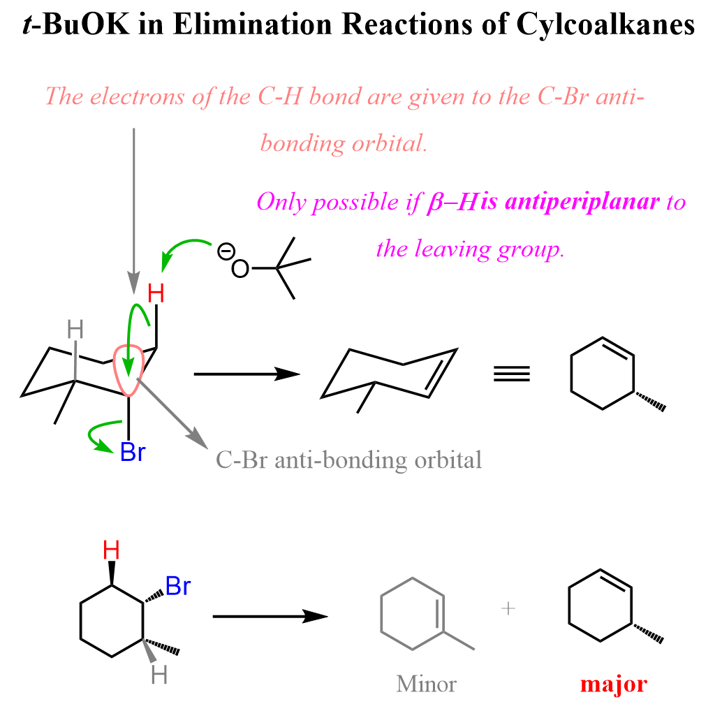 This alignment is the only one that allows the electrons from the breaking C–H bond to be donated directly into the antibonding σ* orbital of the C–Br bond. As t-BuOK abstracts the β-hydrogen, the electrons flow into the σ*(C–Br) orbital, breaking the C–Br bond and forming the double bond in a single concerted step.