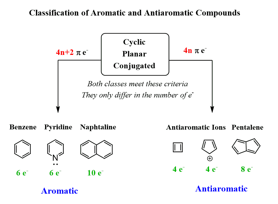 To summarize, both aromatic and antiaromatic compounds are cyclic, planar, and fully conjugated and the only difference is the number of π electrons [Huckel (4n+2) – aromatic, Mobius (4n) – antiaromatic]:
