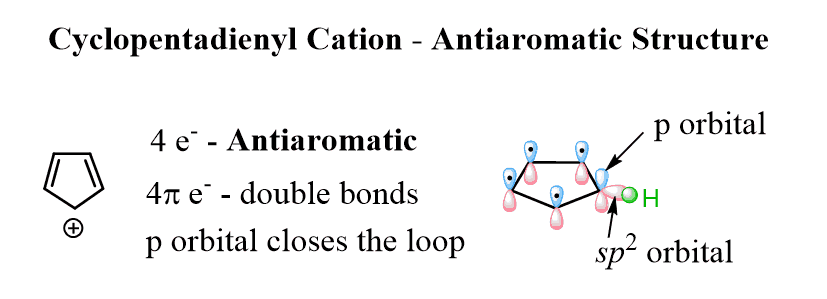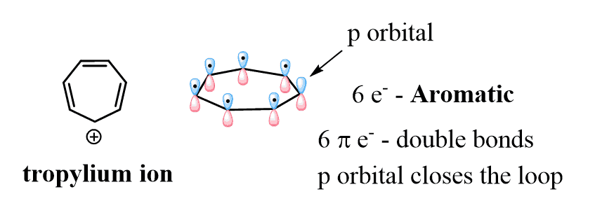 Unlike the cyclopentadienyl cation, it has 6 π electrons thus satisfying the Huckel’s rule, and again the loop of conjugated orbitals is linked by the empty p orbital of the carbocation.