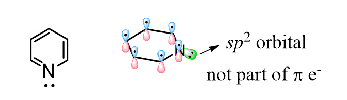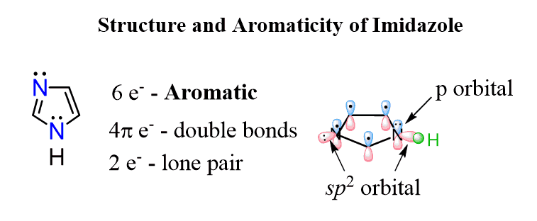 What’s interesting about the structure of imidazole is that it combines then two principles we discussed above for favoring of aromaticity. It has one lone pair in a perpendicular to the conjugated system sp2 orbital which is not part of the aromatic system and another one in a p orbital because the nitrogen with single bonds is sp2 hybridized favoring the aromaticity. This, in total, makes 6 electrons of the aromatic system and one lone pair which is not part of that: