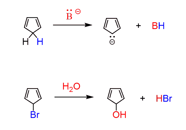 The first reaction is very fast compared to the deprotonation of other hydrocarbons (pKa 40-50). While deprotonation of allylic (next to C=C) C-H bonds requires the use of an organometallic (extremely strong base), cyclopentadiene can be deprotonated with a strong alkoxide (RO–) or a conjugate base of an amine. This indicates that the conjugate base of cyclopentadiene (cyclopentadienyl anion) must be more stable than regular carbanions: