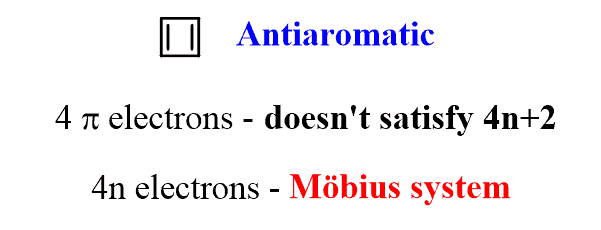 Unlike benzene, cyclobutadiene has only four π electrons and doesn’t satisfy the Hückel’s rule (if n=0, we get 2 e-, if n=1, we get 6 e–). The general formula for the number of electrons here is 4n (Möbius system) and this is the class of antiaromatic compounds which are highly unstable.