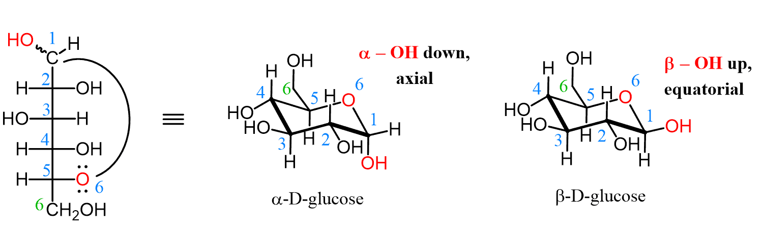 This happens as a result of a 180o rotation about the C1–C2 single bond, which places the C=O group pointing up or down. The attack of C5-OH group on the carbonyl carbon forms the ɑ-D-glucose and β-D-glucose anomers: