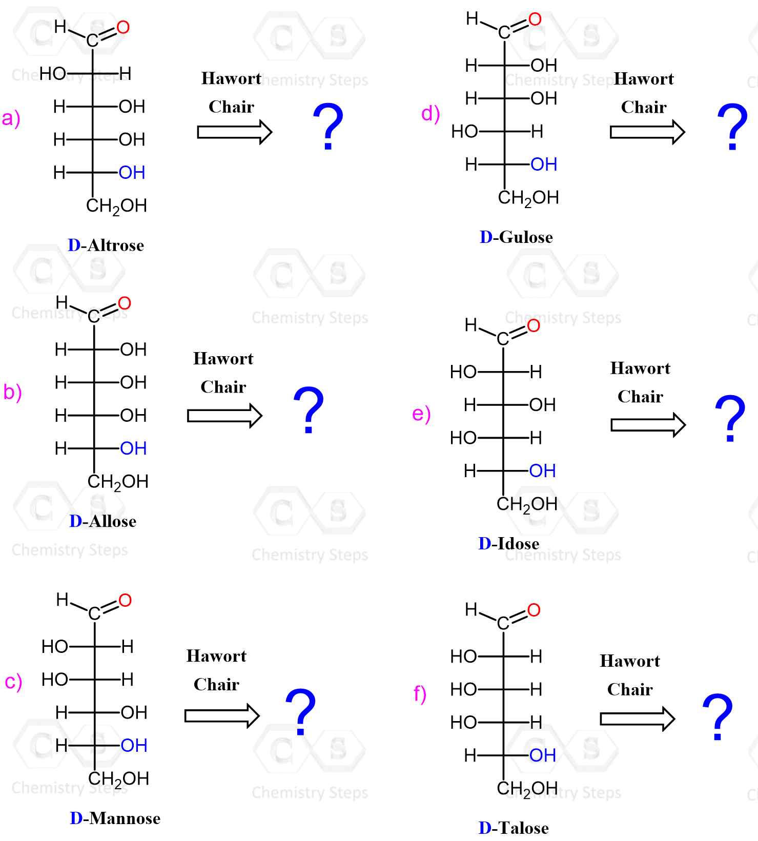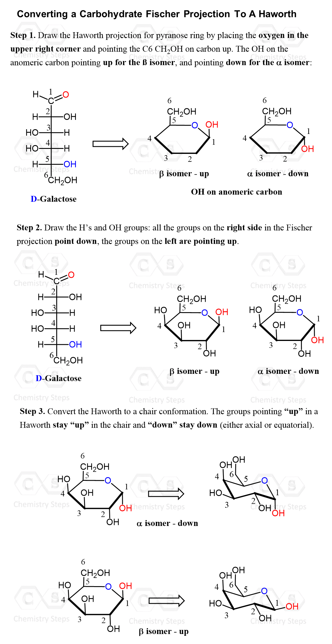 Putting this together in a three-step process, here is a guide you can use in the practice problems below for converting Fischer projection to Haworth and Chair forms: