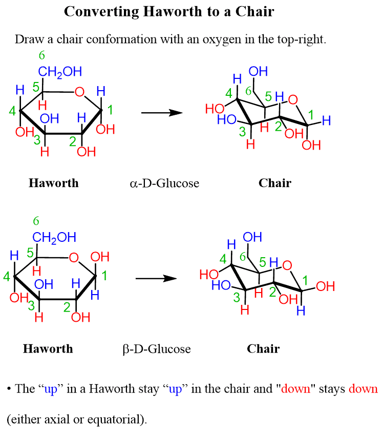 Step 4. Convert the Haworth to a chair conformation if needed. The groups pointing “up” in a Haworth stay “up” in the chair and “down” stay down (either axial or equatorial).