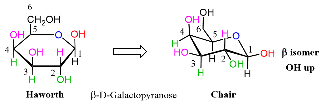 For example, let’s convert D-Galactose into β-D-Galactose pyranose in the Haworth and chair forms.