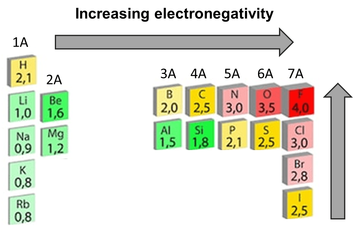 Remember the trends of electronegativity; it increases across a row of the periodic table (left to right), and goes up a column of the periodic table. Here is a table with the electronegativity values of the most commonly encountered elements in organic chemistry: