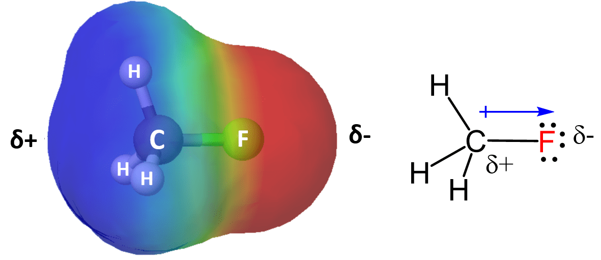 For example, in fluoromethane, shown above, the fluorine atom has the highest electron density, and the carbon atom has less, so this is how the electrostatic map would look: