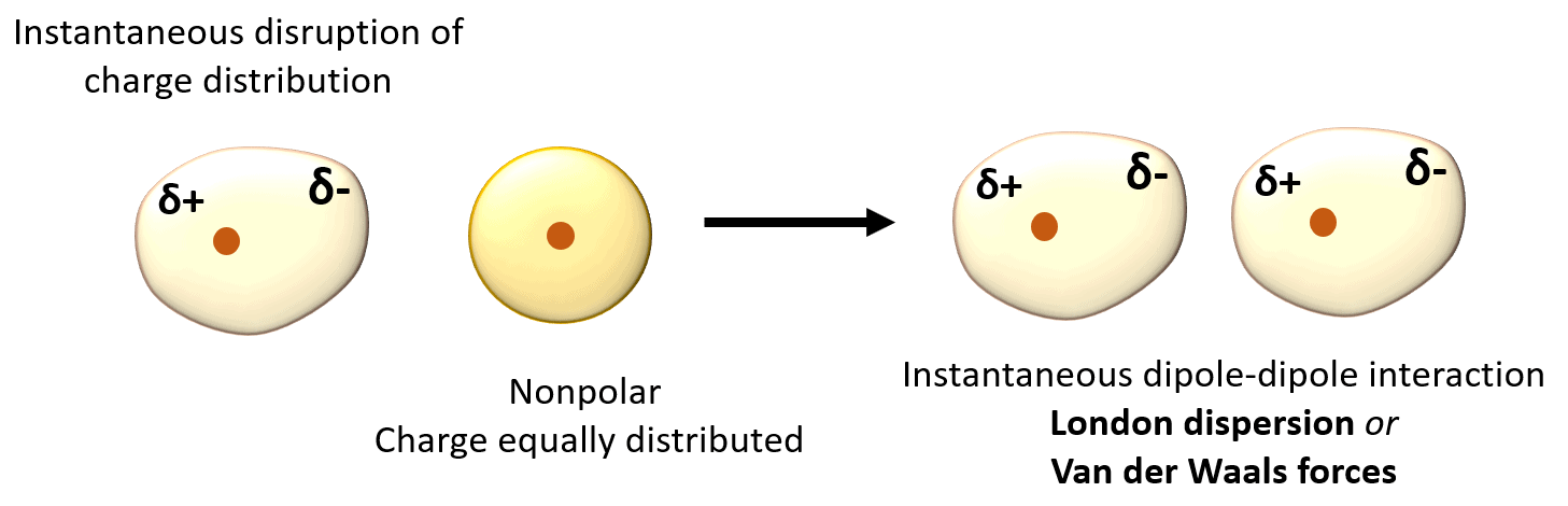 These are the weakest intramolecular interactions and occur as an electrostatic interaction of temporary dipole moments formed in the molecule right at the time when they get close enough. What happens during this instant is that the electron density of the molecule is distorted because of the attracting and repelling forces between the nuclei and electrons of the two molecules.