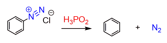 The diazonium group can also be replaced by a hydrogen when reacted with hypophosphorous acid (H3PO2) following a free-radical mechanism: