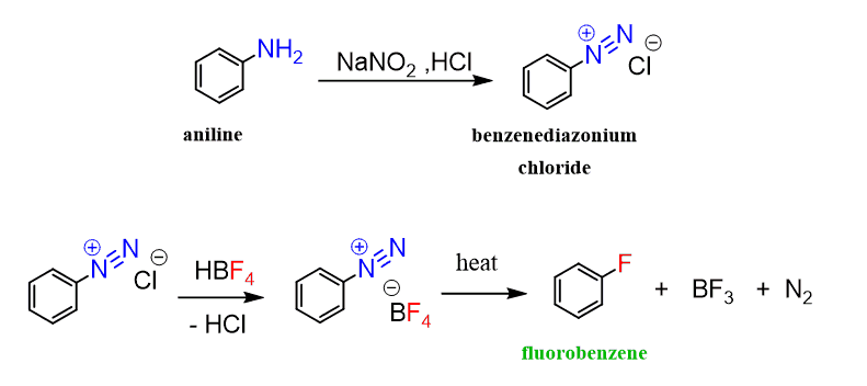 For example, we know that chloro- and bromobenzene can be prepared by halogenation using a Lewis acid catalyst. However, fluorination of benzene is a violent reaction, and fluorobenzene is prepared by first converting the benzene into benzene diazonium chloride, which is then heated with fluoroboric acid (HBF4):
