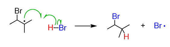 The resulting radical reacts with HBr by abstracting the H, and a new radical Br• is formed: