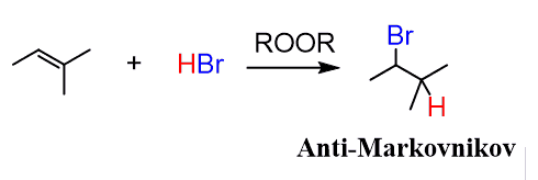 The reaction goes by a radical mechanism when a peroxide is present. The first step is the homolysis (homolytic cleavage) of the RO-OR bond: