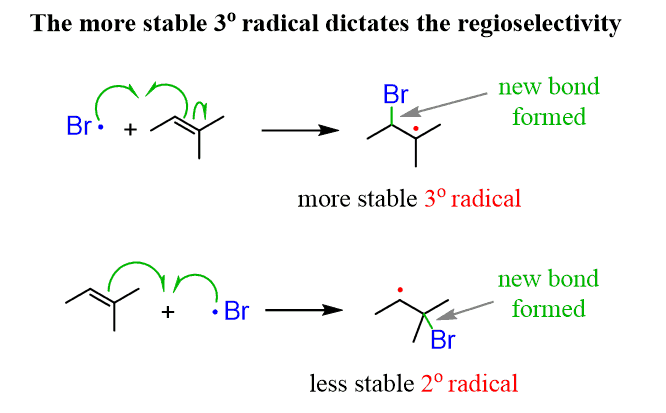 Let’s compare the intermediates in the ionic (Markovnikov) and radical (anti-Markovnikov) reactions to better understand the opposite regioselectivity of the HBr addition: