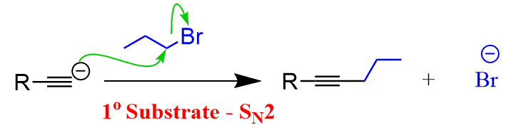 There are two more carbons in the product than in the starting alkene. Therefore, we can deprotonate the acidic proton of the alkyne and react it with ethyl iodide to perform an SN2 reaction and extend the carbon chain: