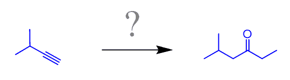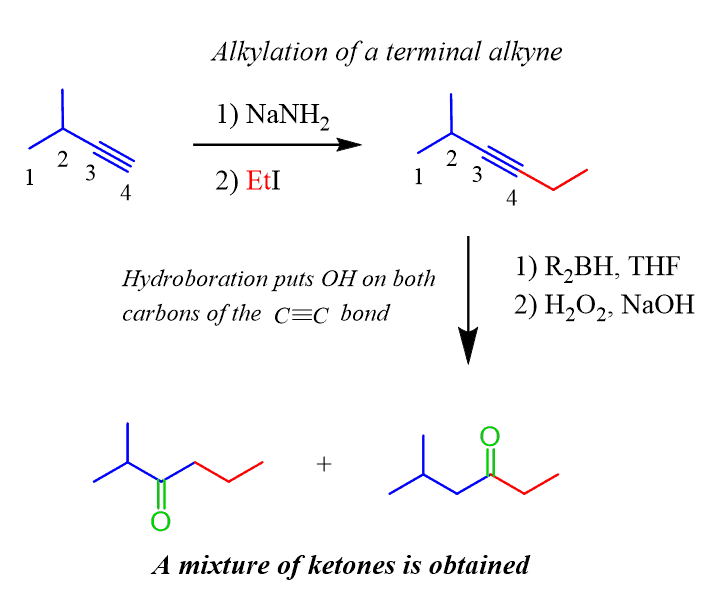 The resulting alkyne can be converted into the desired ketone by either acid-catalyzed hydration or hydroboration-oxidation. The problem, however, is the formation of two ketones as there is no regioselectivity of hydration of internal alkynes.