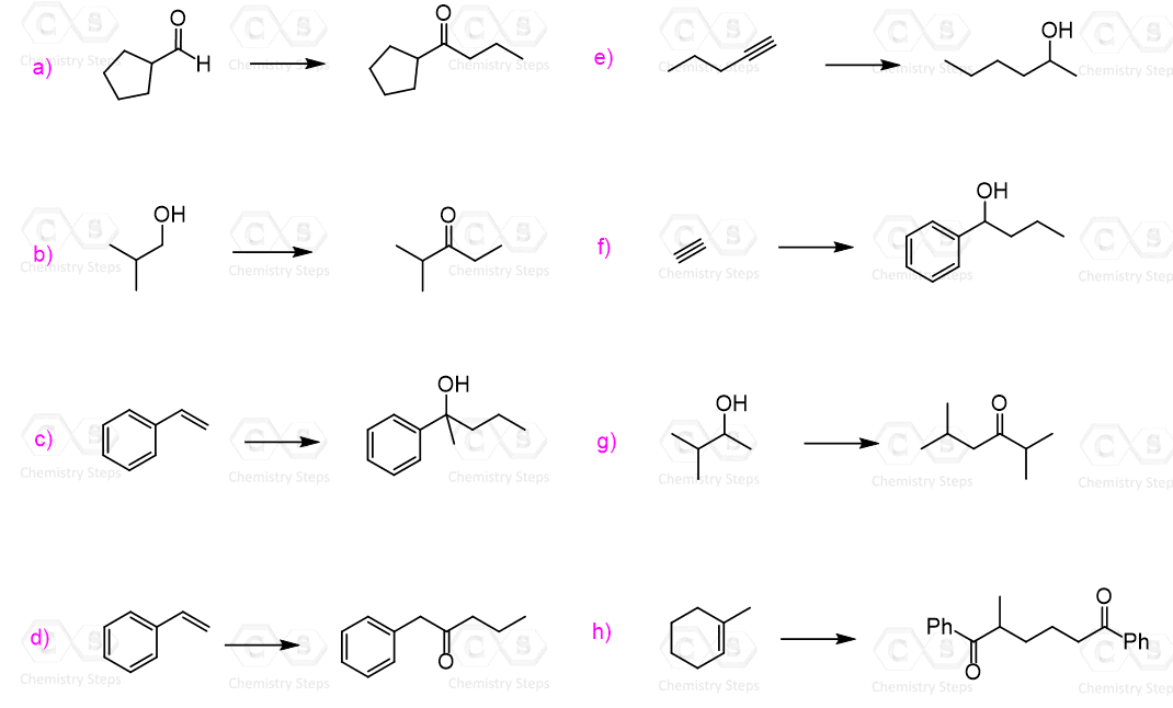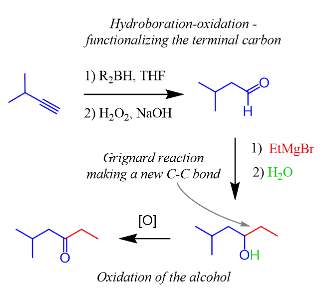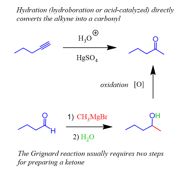 These two approaches of extending the carbon chain can be used interchangeably for preparing carbonyl compounds. While the Grignard reaction requires oxidation of the secondary alcohol into the corresponding ketone, the triple bond can directly be converted into a ketone or an aldehyde using the hydroboration-oxidation of alkynes: