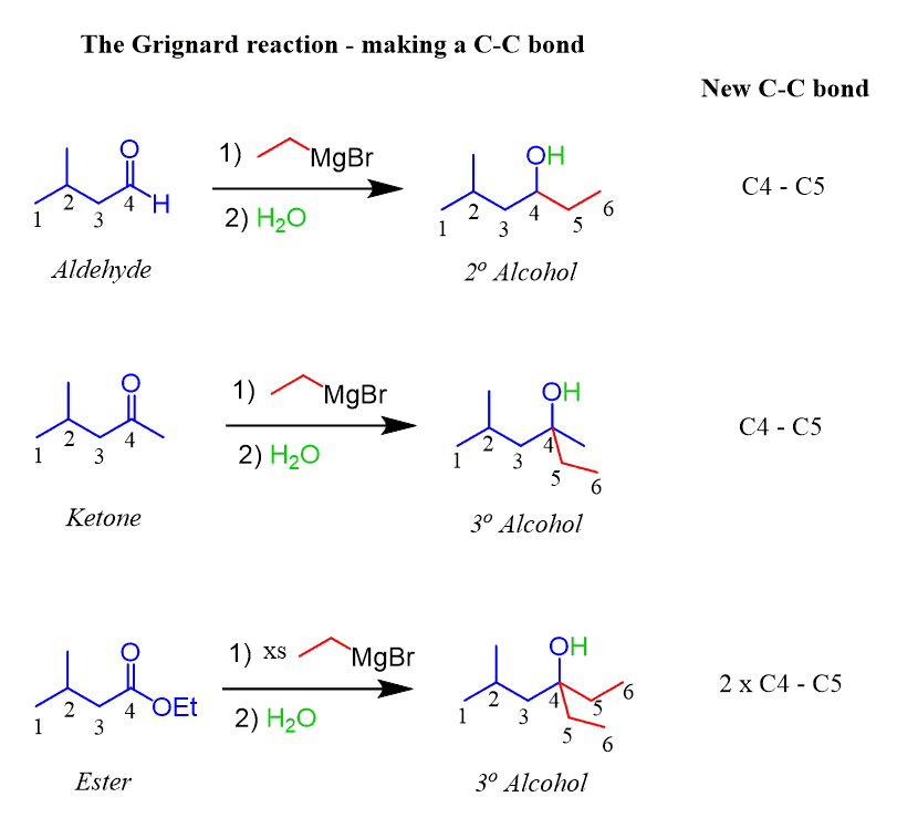 The most common Grignard reaction is carried out with aldehydes and ketones forming secondary and tertiary alcohols and with esters forming tertiary alcohols: