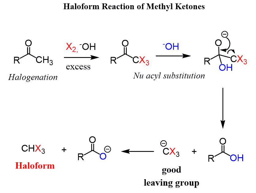 An interesting situation occurs when methyl ketones are halogenated. The intermediate product here is a trihalogenated ketone and these three halogens make it very reactive towards a nucleophilic acyl substitution since the leaving group is going to be well-stabilized: