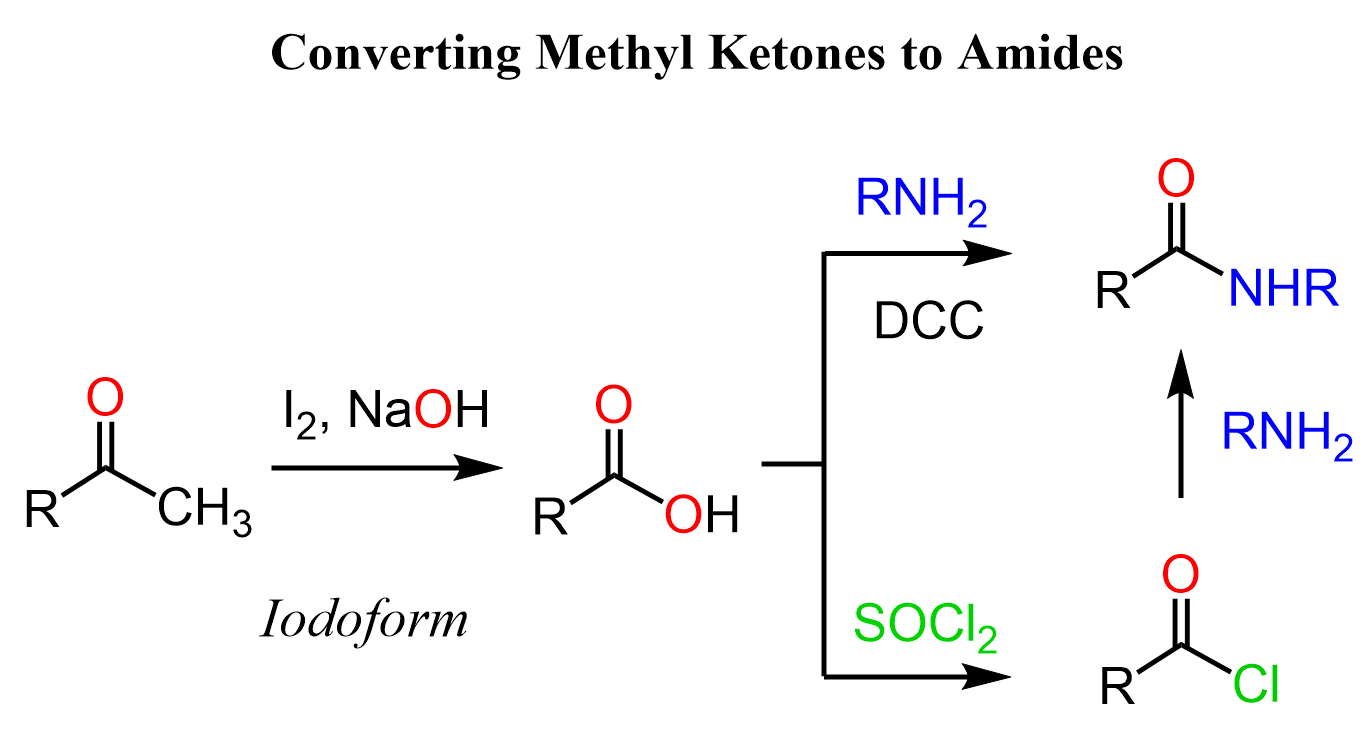 The haloform reaction is not only a test reaction for methyl ketones but can also be used for functional group transformations of carboxylic acid derivatives. For example, we can use it for the conversion of methyl ketones to amides: