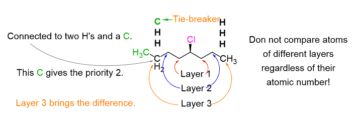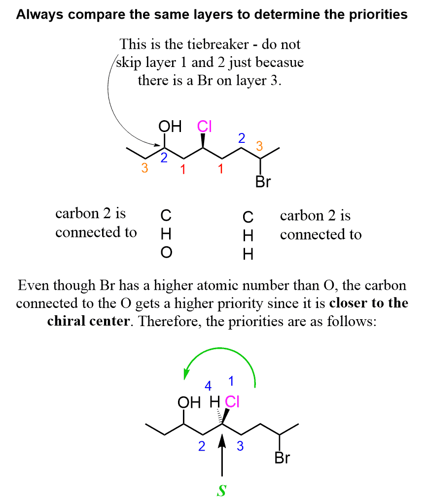 So, we do not compare layers 2 and 3 which would’ve given the priority to the carbon with a Br since Br has a higher atomic number than oxygen. Because the oxygen is connected to a carbon closer to the chiral center, it gives the priority to that carbon regardless of what is connected to the carbon atoms on the next layer: