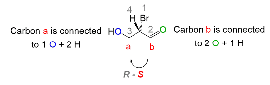 Bromine is the priority and the hydrogen is number four. Carbon “a” is connected to one oxygen and two hydrogens. Carbon “b” is connected to one oxygen and one hydrogen. However, because of the double bond, carbon “b” is treated as if it is connected to two oxygens. The same rule is applied for any other double or triple bond. So, when you see a double bond count it as two single bonds when you see a triple bond cut it as three single bonds.