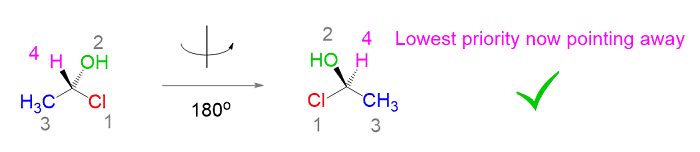Correct, the lower priority is the methyl group and it is in the plane. One option to make it appear in the back is to look at the molecule from the opposite direction of where the methyl is pointing – 10 o’clock. From there, the arrow would look like going clockwise based on the priorities assigned shown in the example, so the absolute configuration is R.