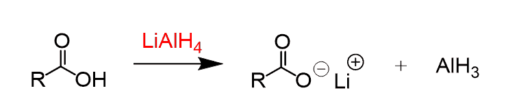 The reduction of carboxylic acids also requires an excess of LiAlH4. The first reaction between a carboxylic acid and LiAlH4 is simply a Brønsted–Lowry acid-base reaction: