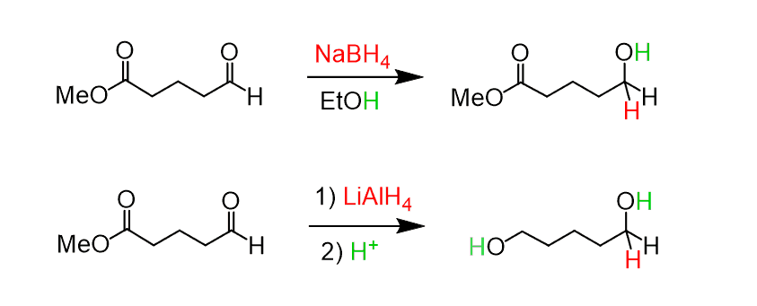 Notice that LiAlH4 and NaBH4 reduce aldehydes and ketones to primary and secondary alcohols, respectively. Esters, on the other hand, are converted to primary alcohols by LiAlH4.