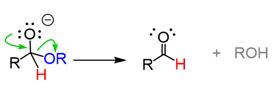 The negatively-charged oxygen is then converted into a leaving group by coordinating to aluminum. This is kicked out by the lone pairs of the other oxygen, restoring the C=O π bond, and the resulting aldehyde is reduced just like we have seen above.